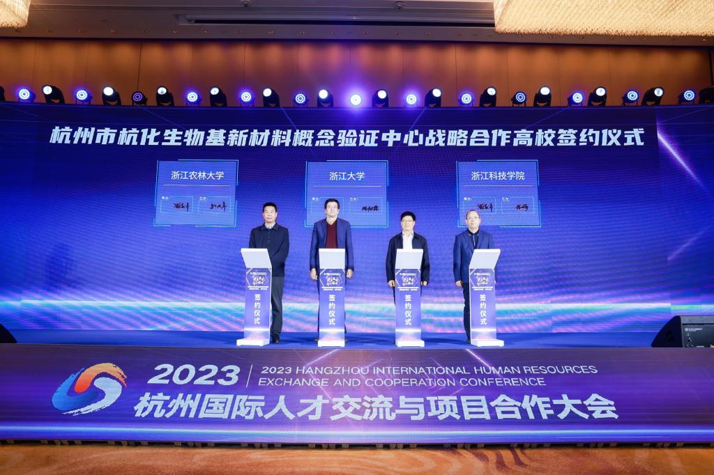 院长刘赫扬、党总支书记李俊,以及轻化工程系专业教师与研究生等共50余人参加了此次峰会。沙力争教授代表浙江科技学院与浙江大学、浙江农林大学共同签约杭州市杭化生物基新材料概念验证中心战略合作高校,推动生物基新材料的创新发展与成果转化。