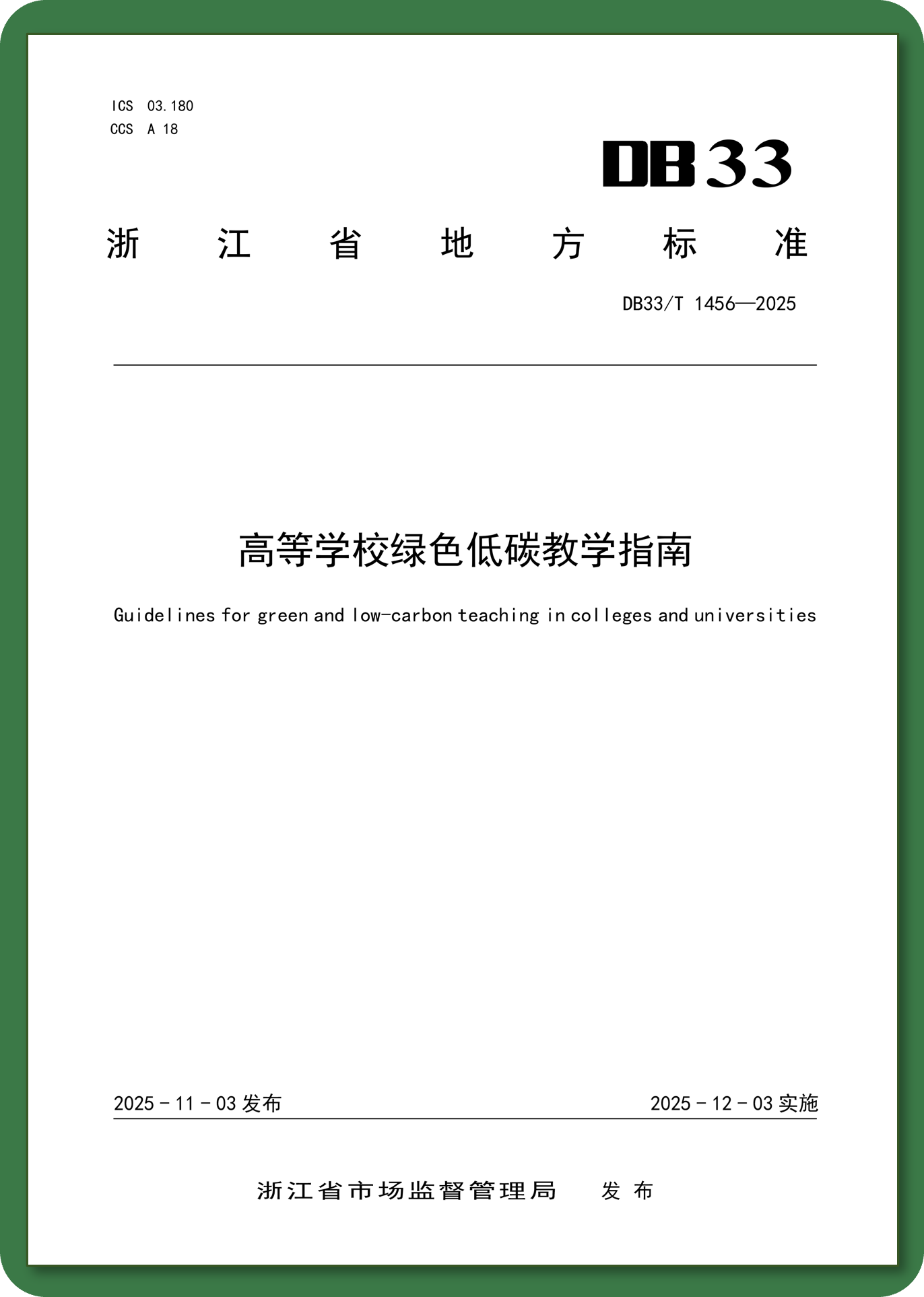 牵头,联合中国计量大学、浙江大学、浙江工业大学、浙江理工大学、浙江师范大学、温州大学等14所高校和浙江省循环经济学会、浙江省绿色科技文化促进会等社团组织共同起草的浙江省地方标准《高等学校绿色低碳教学指南》(DB33/T 1456-2025),经专家审定,已于2025年11月3日由浙江省市场监管局正式发布,并将于2025年12月3日正式实施。
