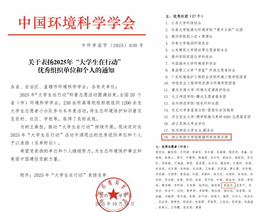 “碳路先锋”实践团同时荣获中国环境科学学会授予的“优秀社团”称号,团队负责人章俊杰荣获“优秀志愿者”称号,展现了团队在推动绿色低碳大中小一体化工作中的专业素养与社会影响力。
