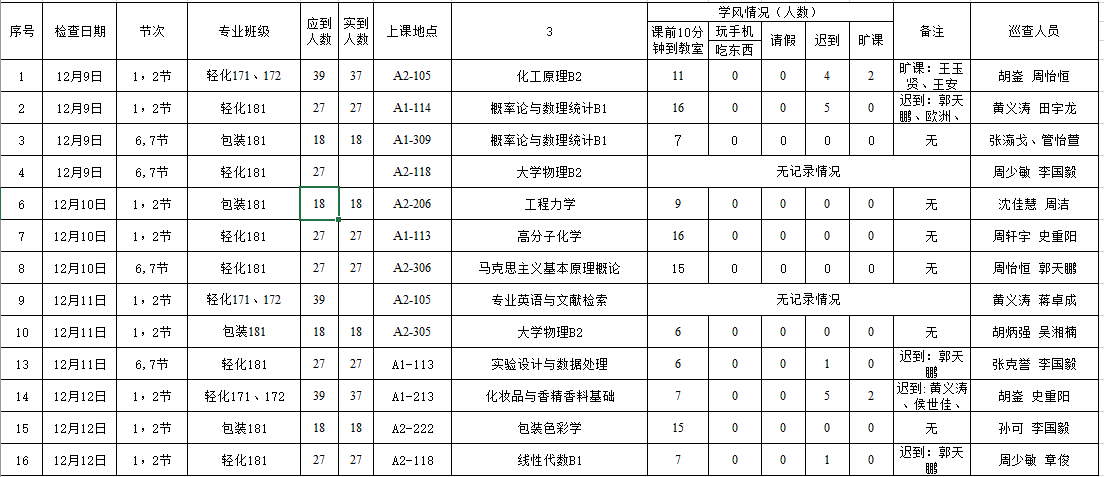 在本周的学风检查中,没有出现吃早餐和玩手机的现象。提前十分钟到达教室的情况与上周基本相同,人数较少。有些班级迟到和旷课同学减少了很多,但是个别班级的迟到以及旷课同学稍有增加。在最后的考试冲刺阶段希望大家不要放松,争取在期末考试中取得好成绩!