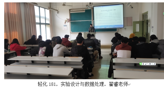 轻化181,实验设计与数据处理,翟睿老师,应到27人,13:20分到教室6人,13:25分到12人,13:30到26人,其中迟到1人(郭天鹏),教师备课充分,课堂氛围较好,部分同学积极性有待提高。