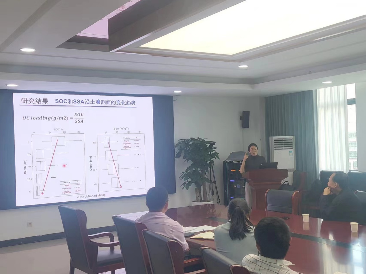 在学术报告中,贾冯文婷研究员从土壤有机质功能、化学组成、稳定性变化、保护机制等多方面介绍土壤有机质的热稳定性并同参会师生进行了互动交流与讨论,对土壤有机质的相关问题进行了详细解答和交流讨论。