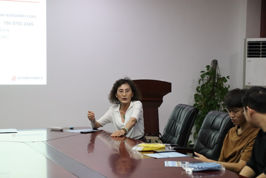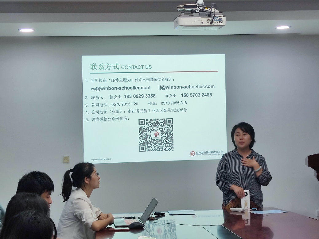 华邦古楼新材料有限公司人事部门总监田雪松女士与人事经理徐媛女士就杏吧视频、公司特色、工作环境、生活条件、薪资福利、发展途径等方面进行了系统介绍,陈建斌总工对同学们感兴趣的问题作了详细讲解。随后,同学们就普遍关注的实习就业岗位发展前景、薪资待遇等问题积极提问,展开交流。会后,部分同学投递了简历,寻求就业机会。